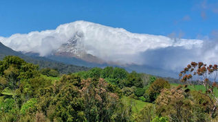 Nach Verlassen des Waldes fällt der böige Wind über uns her und der Himmel wird von Osten her zusehends bewölkter. Immerhin sehen wir an einer Stelle zu unserer großen Begeisterung noch den Mount Taranaki, nur knapp mit seiner Wolkenmütze bedeckt, und man kann die Schneegrenze sehen.